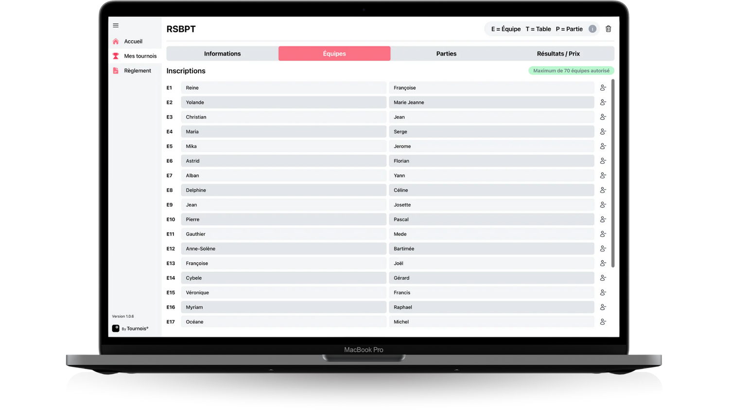 Tournois Apps est conçu pour être utilisable sur Mac (puce Apple et Intel) et Windows.