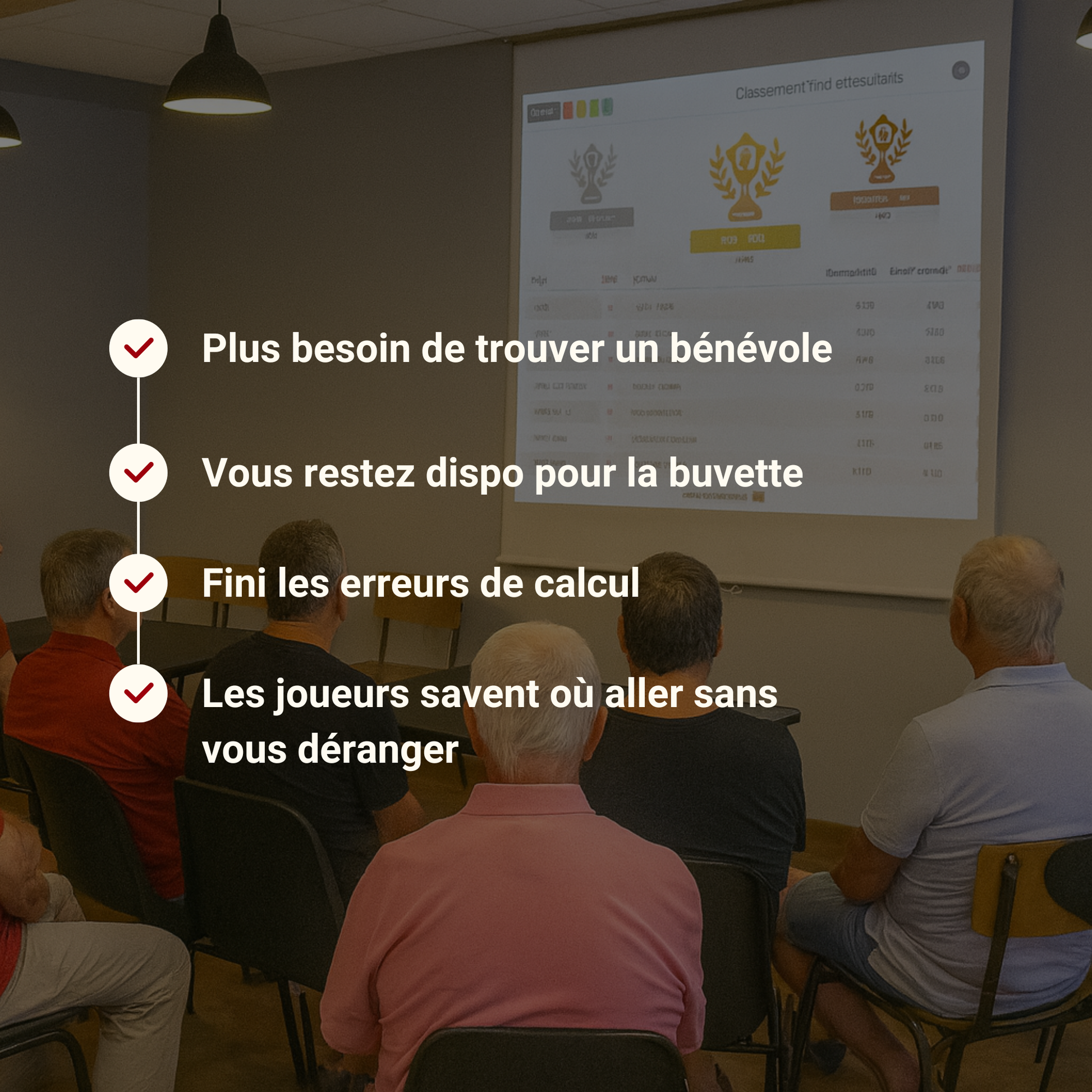 Lancez votre tournoi et gérez-le simplement : saisie des scores, classement en direct et déroulement fluide du concours. Vous n’avez plus qu’à profiter de l’ambiance.